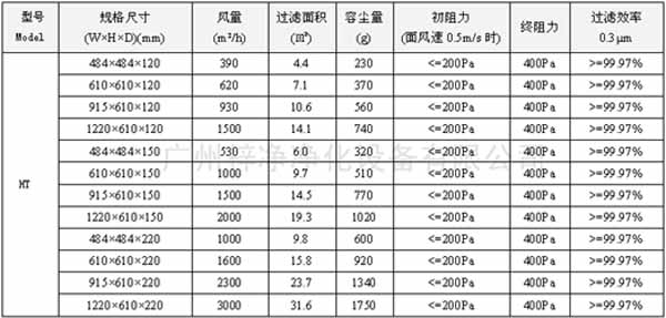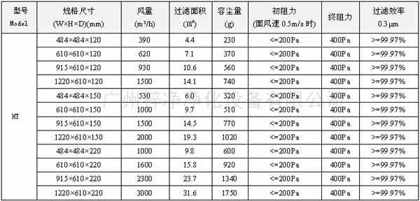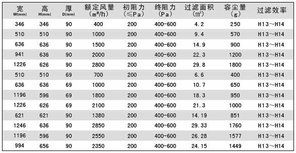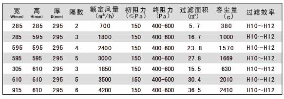有隔板高效过滤器规格尺寸及风量容尘量技术参数: