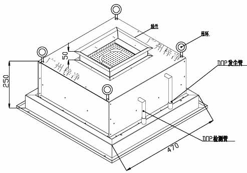 DOP液槽式高效送风口包含静压箱,散流板,液槽高效过滤器,和风阀。与风管的接口可为顶接或侧接。