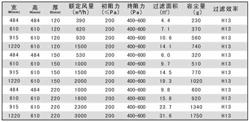 纸隔板高效过滤器过滤效率等级: H11,H12,H13,H14 (EN1822)